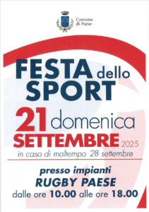 Domenica 21 settembre torna la Festa dello Sport 2025: un’intera giornata dedicata al movimento, al divertimento e alle associazioni sportive del nostro territorio. Saranno presenti: Volley marca Paese • Ginnastica militare Istrana • Old yeti ski club Paese • Sekiko aikido Paese • Basket Paese • Karatè Treviso • Pallamano Paese • Polisportiva Olimpia Postioma • Asd Polisport Paese • Rugby Paese • Polisportiva Sambughé • Karatè Paese • Puddle Paese • Danza hip hop Paese • Capoeira Istrana •…